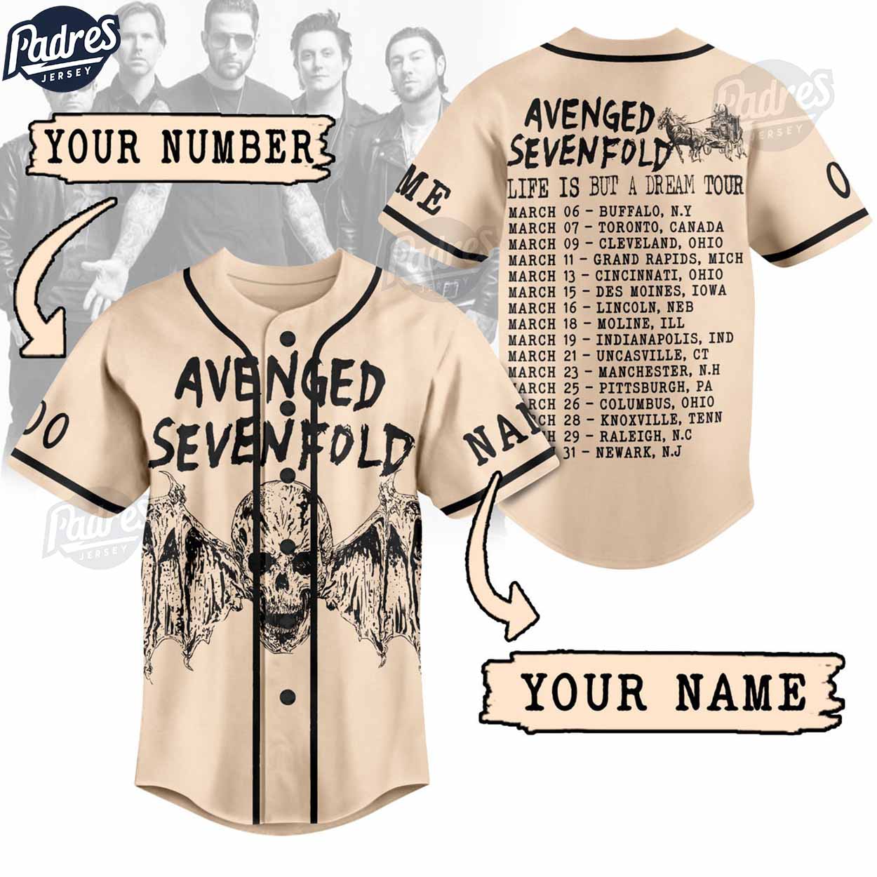 Avenged Sevenfold Life Is But A Dream Tour Custom Baseball Jersey Shirt - Padres Jersey Oasis: Elevate Your Baseball Style Game