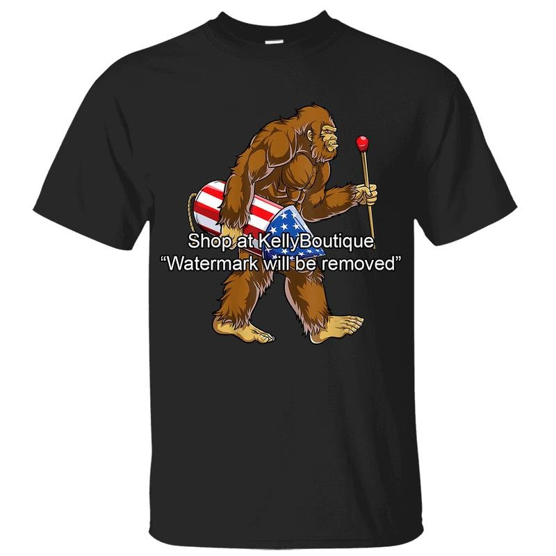 Bigfoot Fireworks 4th of July Sasquatch American Flag US T-Shirt, Independence Day Patriotic Front Sided Design Unisex Cotton T-shirt for Men for Women