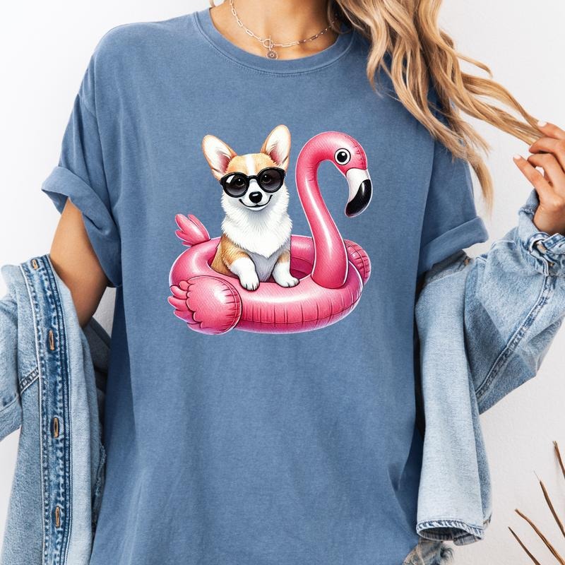 Corgi Flamingo Float Dog Shirt ~ Unisex Apparel Relaxed Fit Printed In The USA Clothing Womenswear Casual Comfort Cotton Top Athletic Boho Chic
