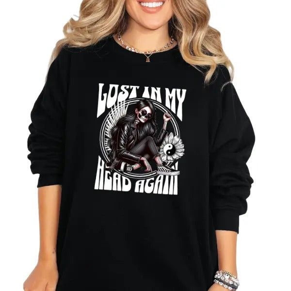 'Lost In My Head Again' Streetwear Style Crewneck Sweatshirt, T Shirt, or Hoodie | Grunge Aesthetic Pullover Retro Vibes | Casual, Comfort, Skulls