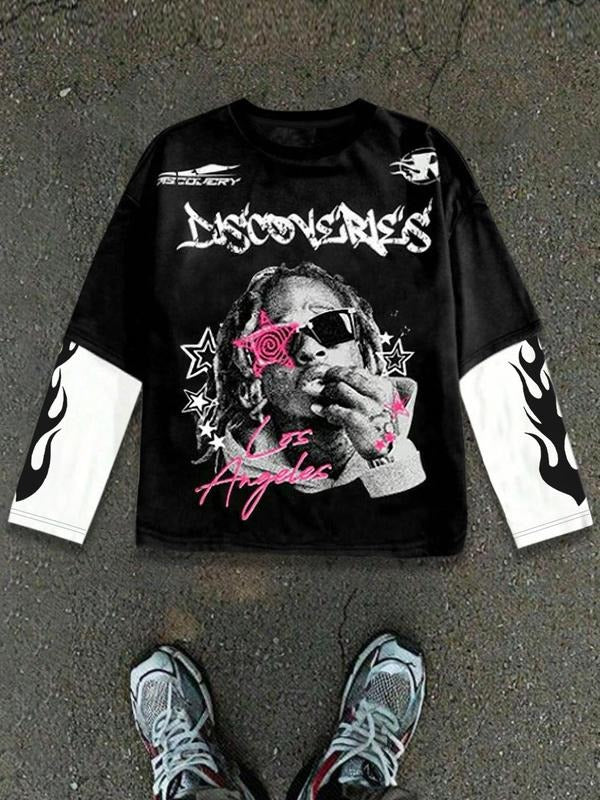 Men's 2 in 1 Patchwork Graphic Print Long Sleeve Tee, Regular Fit Casual Retro Street Round Neck T-shirt for Spring & Fall, Men's Top for Daily Wear
