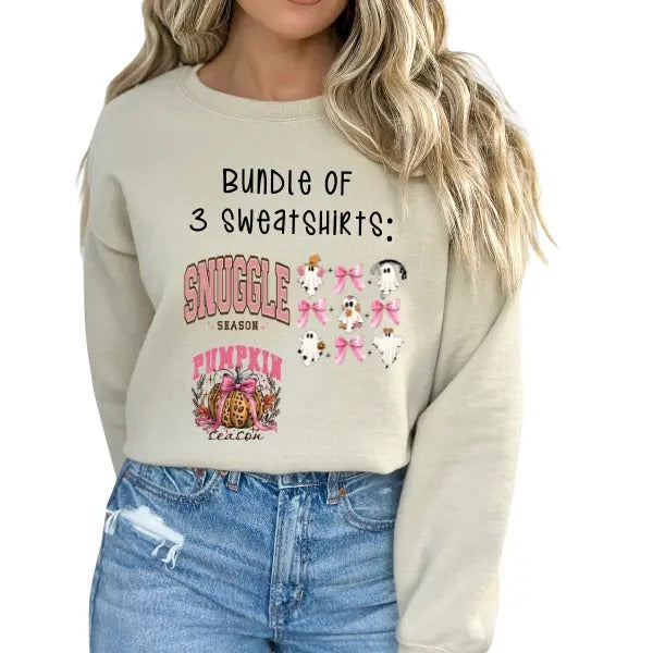 Set of 3 Trendy & Cozy Fall Sweatshirts: Pumpkin Season Coquette Style on Sand, Pink Ghost with Bow on Pink, & Snuggle Season on Sand | Adorable & Cute Designs Perfect for Autumn | Sizes Up to 4XL for Maximum Comfort | Ideal Fall Fashion & Seasonal Vibes